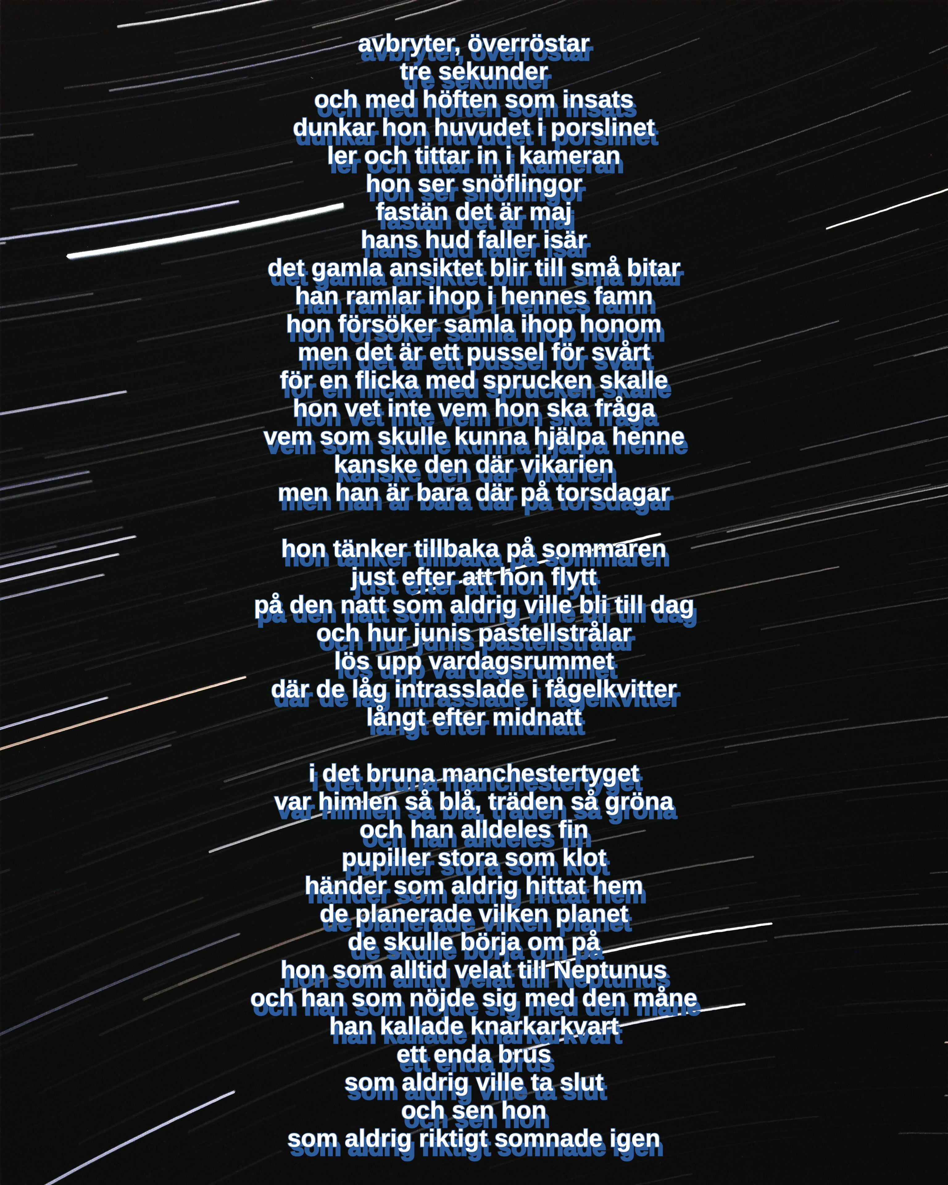 avbryter, överröstar tre sekunder och med höften som insats dunkar hon huvudet i porslinet ler och tittar in kameran hon ser snöflingor fastän det är maj hans hud faller isär det gamla ansiktet blir till små bitar han ramlar ihop i hennes famn hon försöker samla ihop honom men det är ett pussel för svårt för en flicka med sprucken skalle hon vet inte vem hon ska fråga vem som skulle kunna hjälpa henne kanske den där vikarien men han är bara där på torsdagar hon tänker tillbaka sommaren just efter att hon flytt på den natt som aldrig ville bli till dag och hur junis pastellstrålar lös upp vardagsrummet där de låg intrasslade i fågelkvitter långt efter midnatt i det bruna manchestertyget var himlen så blå, träden så gröna och han alldeles fin pupiller stora som klot händer som aldrig hittat hem de planerade vilken planet de skulle börja om på hon som alltid velat till Neptunus och han som nöjde sig med den måne han kallade knarkarkvart ett enda brus som aldrig ville ta slut och sen hon som aldrig riktigt somnade igen